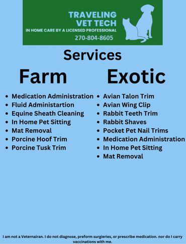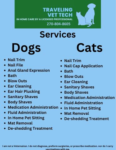 At Traveling Vet Tech ,LLC I am striving to provide exceptional pet services to my customers...furry & non. Making basic veterinarian care less stressful for owner and animals within the comforts of their own home. This eliminates many of the chronic stressors for animals and gives their owners more quality time within their own lives.